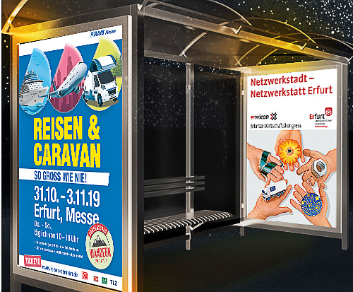Dafür stellen wir Ihnen ein bestens eingespieltes Agenturteam aus Plakatberatung, Plakatkreation und Plakatschaltung zur Seite. Erfahrungsstark und bestens referenziert arbeiten wir für Sie thüringen- oder deutschlandweit.
